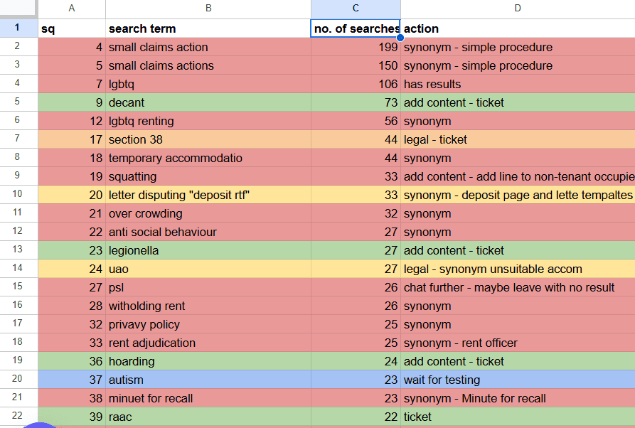 I prioritised the work by sorting by number of searches, and colour coding the cells depending on what needed to be done: